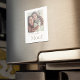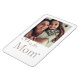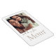 White background magnet featuring a bold taupe serif letter layered near a centred photo. Below, a script phrase reads “is for,” followed by the serif word “Mom” and a small heart. A soft layout combining imagery with meaningful typography.