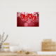 Romantic illustration featuring hanging red hearts with "LOVE" letters on a bokeh background.