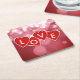 Romantic illustration featuring hanging red hearts with "LOVE" letters on a bokeh background.