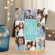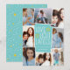 Fun and festive Hanukkah photo card features eight photos arranged in a collage layout. "Love, light, latkes" appears in the centre in white lettering on a bright turquoise blue background accented with stars. Personalize with your names and the year.