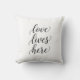 Create a warm and meaningful space with this elegant “Love Lives Here” wall art. Designed in a clean script typography style, this minimal black and white print adds a timeless touch to any home.Throw Pillow