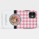 Cute and classy iPhone 5 Case designed in a pink and white houndstooth pattern, with an adorable little brown monkey holding a heart, and custom printed with your name or personalized text.