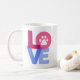 L O V E spells LOVE mug. The "O" in love is a paw print inside. The letters LOVE are shades of pink and purple. Show off your love of four legged friends as you sip on your favourite beverage.