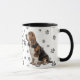 This mug for the Basset Hound Dog owner features a portrait of an adorable Basset. The image is printed twice, and between them is an oval with the black text that says "Love my BASSET HOUND DOG". The oval and dog images are placed on a background sprinkled with paw prints. Your monogram or name is in a customizable text field at the bottom.