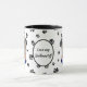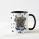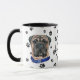 This mug for the Bullmastiff Dog owner features an artist's watercolor portrait of a beautiful Bullmastiff wearing a blue collar. The image is printed twice, and between them is an oval with the black text that says "Love my Bullmastiff". The oval and dog images are placed on a white background sprinkled with black paw prints. You may easily change the text to something else, or personalize it, if you'd like.