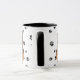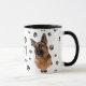 This mug for the German Shepherd Dog owner features a beautiful portrait of a German Shepherd. The image is printed twice, and between them is an oval with the black text that says "Love my GSD". The oval and dog images are placed on a background sprinkled with black paw prints. You may easily change the text to something else, or personalize it, if you'd like.