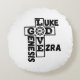 This round pillow features a design that showcases the phrase "Love Of God" in a Bangers print font with the words " Genesis, Luke and Ezra in a crossword like style in this faith based biblical theme. This pillow is made with high quality fabric our pillows are soft and wrinkle-free the cover is machine washable.