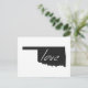 Oklahoma love is easy to spread everywhere through the mail with this post card. With the shape of the Sooner state of Oklahoma filled in black and the word love written inside with white hand written lettering the message is clear that you love the State of Oklahoma.