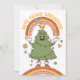 Celebrate the season with this whimsical and heartwarming design! Featuring a cheerful Christmas tree character, complete with festive lights and cozy boots, standing under a vibrant rainbow with the message "Love, Peace, Christmas." This fun and colourful image exudes retro vibes and is perfect for spreading positive energy and holiday cheer with a dash of nostalgia.