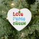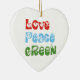 Love, Peace, Green custom ornament, featuring the words Love, Peace, Green with fun fonts with hearts, the 60’s sign of peace and leaves.