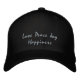 Fits well due to elastic edging, not adjustable. Good qualty material. Good quality embroidering. Subtle lettering (white on beige) just as my wife likes.