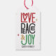 Love, Peace, & Joy - red, black, and green on a background with sparkles