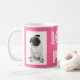 Show your love for the Pug with this cute Pug mug. This fun coffee mug features a portrait of a Pug puppy dog highlighted against a bright pink background with the words Love Pug in a large fun whimsical font.