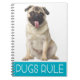 Pugs Rule! This cute Notebook features a fawn coloured puppy standing on a white background. The words Love Pugs is printed in white letters on a royal blue band below the dog.