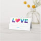Love is love is love. Wedding escort place card features a colourful "Love" typography design with heart accent and beautiful gradient of rainbow colours.