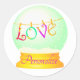 This snow globe features the word love hanging by clothespins on a clothesline. Snow globe is done in cheery bright colours of lime green, yellow, white and gold. The word love is done in red, purple, goldvand turquoise with decorative embellishments. It is ready to personalize if you wish.