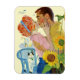 Artist:Bernard D'Andrea | Red-haired lady kissing man behind sunflowers with a blue chair and a cat.