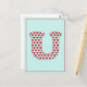 A beautiful and simple postcard to say I love You. The letter U outlined in red with an infill print of red hearts printed on a pale teal background.