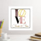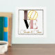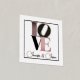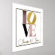 Romantic foil print, with The word LOVE done in gold, pink, black and taupe, set on a white background, with a thin gold frame around the outside edge. Personalize the gold text, across the bottom, to read what ever you wish.
