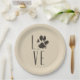 A paper plate with a cute illustration of a sketched dog paw print in brown with a grunge style. The letters spell out the word "Love" with the paw print in place of the letter "o". Awesome for pet lovers.