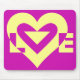 A graphic logo design, custom made. LOVE in yellow on purple.