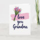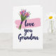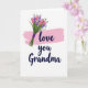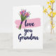This greeting card shows a bouquet in the upper-left corner with pink tulips and purple lavender tied together with a deep purple ribbon. Below the flowers, a wide sweep of soft pink paint stretches across the card like a gentle background wash. The message “love you Grandma” sits over and just below that pink area in navy blue letters that look like smooth, flowing handwriting. The flowers feel calm and caring, with the tulips bringing a sweet romantic warmth and the lavender adding a peaceful, comforting touch. The mix of pinks, purples, and green leaves keeps the whole scene soothing and easy on the eyes. It feels meaningful to give because it says love in a simple way while also showing care through the thoughtful flower choice. It’s a lovely reminder that affection can be steady and tender, especially for someone who’s always been there 🥰❤️.