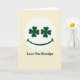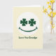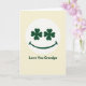 The front design shows a creamy background with a bright white circle centered like a spotlight. Inside the circle sits a simple smiling face, where the eyes are two dark green four-leaf clovers ☘️ that seem to “look” back with an affectionate, family-focused warmth. A smooth, upward-curving dark green line forms the mouth, giving the face an easy, friendly grin that feels like a gentle nod between close loved ones. Beneath the circle, the words “Love You Grandpa” appear centered in a plain sans-serif font, colored the same deep green 💚 as the clovers and smile. The limited palette of cream, white, and rich green keeps everything calm and focused, with the clovers adding a subtle St. Patrick’s Day touch. The spacing leaves plenty of breathing room, so the message reads clearly without crowding the artwork. Share St. Patrick’s Day sentiments with someone special. The two clover eyes sit evenly spaced above the curved green smile within the white circle.