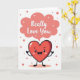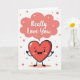 This card features an anthropomorphic red heart character centered low on a bright white background, beaming with wide sparkly eyes, a big smile, and rosy cheeks that read like a shy crush 🥰. Small arms and legs extend from the heart, with one little hand raised in a friendly wave that feels like an eager hello. Above the character, a soft coral speech bubble floats near the top half, adding a gentle, romantic focus ❤️. Inside the bubble, the words “Really Love You” sit neatly in the middle in a friendly, rounded lettering style, colored to match the coral tone. Around the heart, tiny coral dots are sprinkled like confetti, keeping the space airy while hinting at excitement. Within the speech bubble, small white starburst shapes add sparkle and a light, dreamy touch. The overall layout stays simple with lots of open white space, coral accents, and the red heart character anchoring the lower portion of the design.