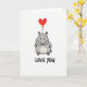 This Valentine’s Day card features a cute gray cartoon hippo set against a white background. The hippo holds a red heart-shaped balloon on a thin black string, which floats just above its head and draws the eye right away. With small dot eyes, a wide smile, and two tiny front teeth showing, the hippo looks cheerful and sweet. Simple black outlines define its round body and face, keeping the focus on the character and the heart. Near the bottom, the words “LOVE YOU” appear in black handwritten-style lettering, centered and easy to read. The open space around the design gives it a calm, sincere feel, making it a thoughtful choice for sharing affection with a partner, friend, or crush on Valentine’s Day.
