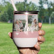 Trendy pink 5 photo collage, two hearts and your signature we love you mom handwriting script typography Mother's Day personalized pink wine tumbler. Perfect keepsake gift for mom, grandma, sister, or aunt.