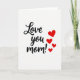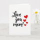 This greeting card features the message “Love you mom!” in black, flowing cursive-style lettering placed front and center on a white background. To the right of the words, four red hearts appear in a small cluster, with a couple slightly larger than the others. The hearts look like they’re gently drifting upward, which adds a soft sense of motion. The bright red against the white space makes the design feel focused and easy to take in at a glance. It comes across as affectionate and grateful, like a simple note you really mean. Giving it feels meaningful because it says what many people want to say to their mom, without needing a long explanation 🥰. It’s a sweet way to share Valentine’s Day feelings with someone you love ❤️.