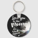 A spacey design featuring the phrase "Love you to the Moon and back again" in white. Dark space background with stars, dust, and the moon.