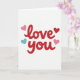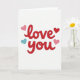 This greeting card features the words “love you” in smooth, flowing red letters placed right in the center. The letters look slightly raised, almost like they sit on top of the white background, which makes the message stand out. Around the text are four small hearts that add a sweet touch without feeling busy. Two hearts are light pink, one is a deeper red, and one is a soft teal that gives a nice change of color. The hearts also appear slightly raised, matching the look of the main message. The layout is simple and easy to read, with lots of open space that keeps the focus on love and closeness