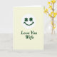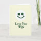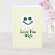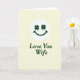 This card features a simple vertical layout on a pale cream background, centered around a dark emerald green smiling face inside a white circle. The smiling’s eyes are two small four-leaf clovers, giving it a lucky, affectionate look that feels like a private joke shared between close partners or dear friends ☘️. The curved smile is smooth and friendly, and the deep green color stands out softly against the light backdrop. Below the circle, the words “Love You Wife” sit centered in the same deep green, set in a classic serif style that reads like a quiet, devoted note 💚. The spacing is airy, with plenty of open space around the icon and the text so the message feels focused and intimate. The overall scene stays uncluttered, letting the clover eyes do most of the flirting while the line of text anchors the design. The green face and lettering align neatly down the middle, with the white circle forming a crisp border around the smiling. The final look is a centered emerald smiling with clover eyes above the deep green “Love You Wife” on a pale cream field.