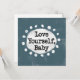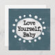 Bold text reading "Love Yourself, Baby" is centred against a grey background. The black text sits on a white circle with large textured white dots around it, providing a playful contrast against the colourful backdrop.