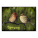 This Earth Day card features a pair of house finches perched on a branch. The male has red plumage on his head and breast. The female is tan and brown with stripes. They stand out beautifully against the luminous green background. The text reads: Think green! This planet needs our love. It can be customized to suit your needs.