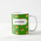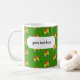 A romantic mug for a loved one, featuring a pair of devoted lovebirds cuddling on a branch. Drawn in the pixel art style. A gift for Valentine's Day or a romantic gesture for any time of year. Love birds are affectionate and monogamous small parrots, native to Africa. This drawing is based on the colourful Fischer's Lovebird species with it's green and orange plumage, red beak and and white eye rings. Change the default text to your preferred name, message or caption; text changes are reflected on both sides.