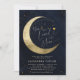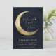 A chic, modern, and gender-neutral baby shower invitation showcasing a crescent moon mobile with a gold-effect (please note, not real foil!) and delicate stars dangling below. The title, "You are loved to the moon," is beautifully written in modern calligraphy over a deep navy watercolor background with soft gold splashes (also a digital effect).