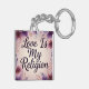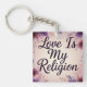 This keychain features a floral-theme with soft purple and pink flowers framing the elegant script: "Love Is My Religion," symbolizing love as a guiding, spiritual belief. Finished as a mixed media art print.