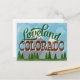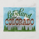 Loveland Colorado neo vintage travel poster wall art in cartoon retro style. It features snowy mountains and forest below with fun and happy retro text.
