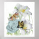 Lovely Garden Scene - Posters & prints feature the original artwork of Marilyn (Tidland) Straus. The garden scene is composed of a blue rose, Easter lillies, a painted lady butterfly and a swallowtail butterfly. The background shown is white but you can make it any colour you choose. A beautiful gift for nature lovers, gardeners, and more.