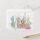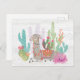 A soft, watercolor with a llama lounging among cacti. Artist: Mary Urban