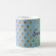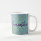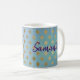 This lovely coffee mug features your name written in stylish purple font. Set upon a blue background with golden coloured diamond patterns, personalize yours today!