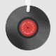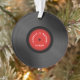 Personalized keepsake ornament for music lovers featuring retro vinyl with custom names, wedding/engagement date and love quote. Text and colour can be changed.