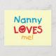Nanny Loves Me T-shirts, cards, stickers, bodysuits bags, and more with colourful red, yellow, and blue text and heart design. These Nanny Loves me apparel and gift items will make nanny smile!