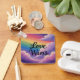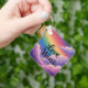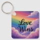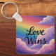 This keychain features a whimsical oil paint print of a dreamy rainbow cloudscape with the reminder message that Love Wins in a dainty cursive script.