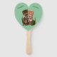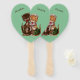 This program hand fan is mint green with a cute loving cat couple. The female is yellow and white striped the male is brown. Female cat is sharing rats from her wood green basket with her male friend. Customize your names with the templates.
