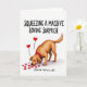 This charming card showcases a sweet moment with a lovable, light brown dog set against a simple white background. The dog is looking down at a scattering of vibrant red heart-shaped petals, adding a touch of romance to the scene. It wears a bright red collar that fits perfectly with the loving theme of the image. In the background, two elegant red heart lollipops add to the loving atmosphere. The white backdrop keeps the focus on the dog and the red elements, creating a warm and cozy feeling.