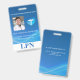 Vertical License Practical Nurse (or other as you can change initials and job description by using text boxes provided) Photo ID Badge. Design with blue background with undulating wave light design -making design hard to replicate by impostors- Keep our blue and teal heart medical logo or add easily your own company logo by using our template image. LPN initials at the bottom in blue over white rectangular stripe NOTE: if using a BUDDY SYSTEM: white rectangle and initials text can be changed to any other colours you need by selecting customize further.. Id with photo, name, company/hospital name, and id number. Back with area for information in case badge gets lost. Also available in horizontal presentation.To all Medical staff in the lines, THANK YOU FOR YOUR AMAZING SERVICE!