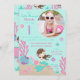 Petite carte d'invitation pour le premier anniversaire de la sirène avec des créatures sous-marines et un modèle d'encart photo.